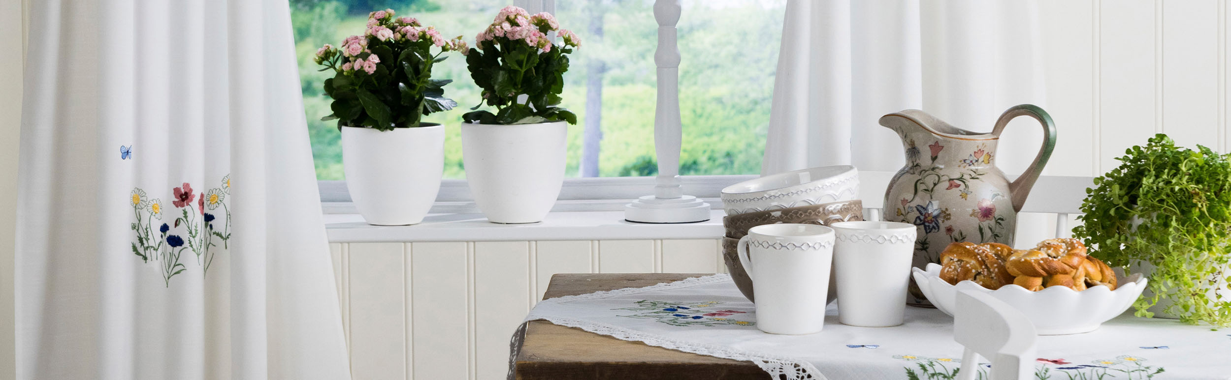 For at du kan skabe en sammenhængende stil, har vi lavet Lisa som kanalgardin, buet kappe, bordløber, dug og kappemetervare. Så kan du matche vindue og bord i det samme bløde udtryk – og lade de broderede engblomster blive den lille detalje, der gør hele rummet mere hyggeligt.