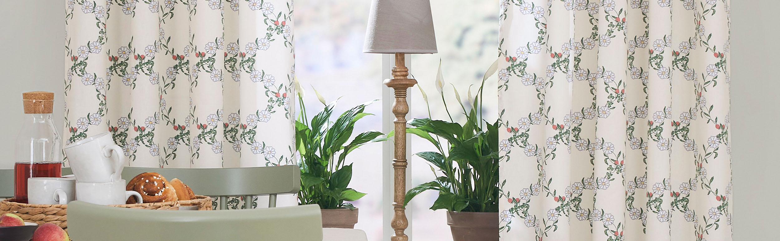 Louise startede med, at vi ville skabe et mønster, der føles som lette sommerdage derhjemme – friskt, blødt og en smule legende, men stadig tidløst. Vi arbejdede os frem til et luftigt blomstermønster med slyngende grønne kviste og små blomster, som giver rummet liv uden at tage over. Resultatet blev Louise: et mønster, der letter udtrykket, skaber harmoni og passer lige så fint i køkkenet som i soveværelset eller stuen.