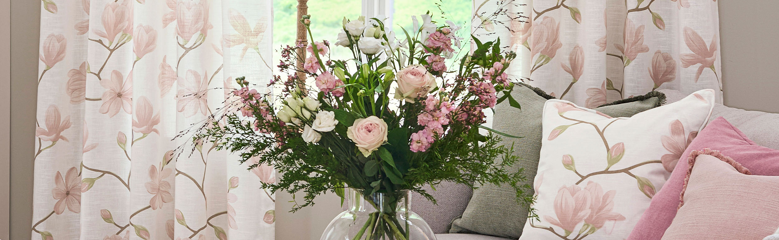 For at du kan skabe en helhed, har vi lavet mønsteret Malena som panelgardin, kanalgardin, rullegardin, stof (metervare) og pudebetræk. Mønsteret findes desuden i tre harmoniske farvevarianter: grå, grøn og hvid/rosa – så du kan vælge udtryk efter rummet. Blødt og varmt, friskt og naturligt eller lyst og stilrent.