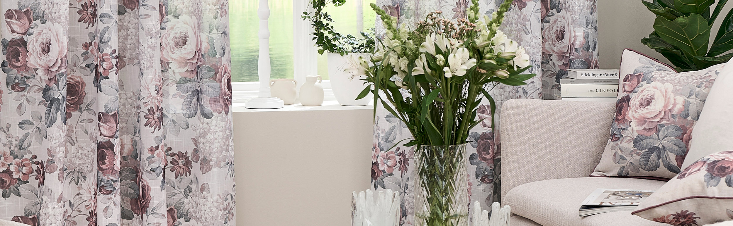 Shivaun startede med, at vi ville skabe et blomstermønster, der føles varmt, hyggeligt og tidløst – et motiv, der giver rummet karakter, men stadig falder harmonisk ind. Vi arbejdede os frem til et romantisk, trykt blomstermotiv med bløde toner og let struktur i stoffet, så gardinerne både indrammer vinduet smukt og lukker dagslyset ind med et blødt fald.