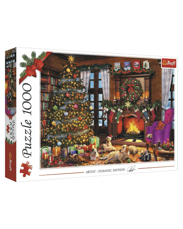 En eventyrlig scene fyldt med julens magi, hvor træet glitrer, og hundene slapper af ved pejsen! Hver brik er nøje des...