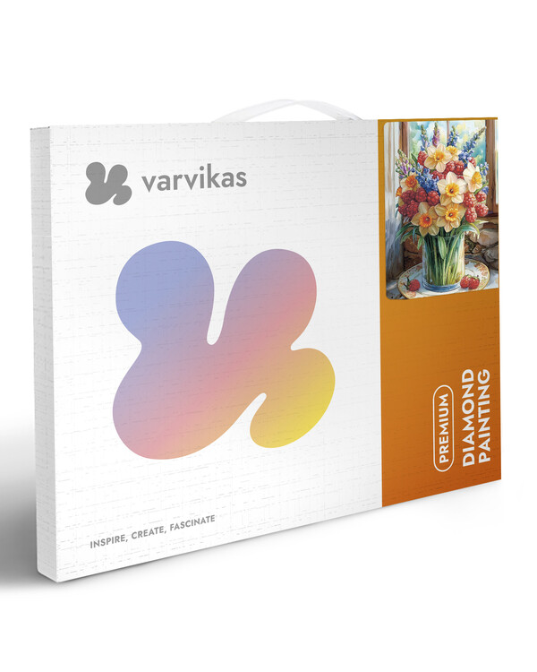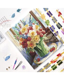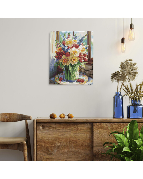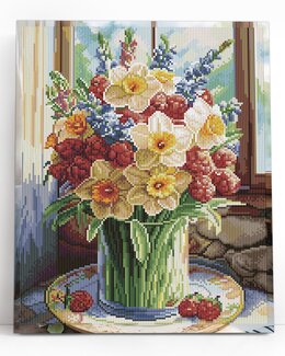 Et dejligt og farverigt motiv, hvor solgule påskeliljer blandes med blå hyacinter og bløde røde hindbær i en glasvase. D...