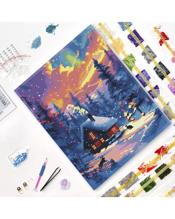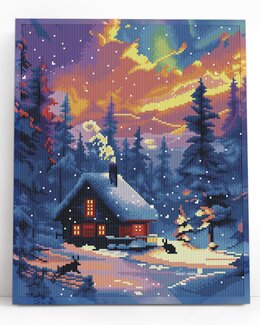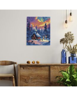 Et magisk vintermotiv, hvor en varm og indbydende hytte lyser op i det snedækkede landskab. Ovenover danser nordlyset i ...