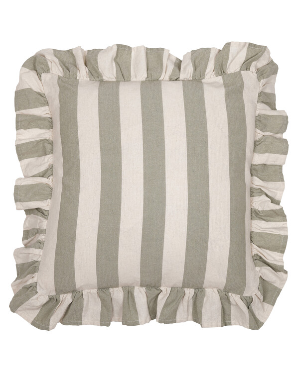 Dette lækre pudebetræk er designet med en tidløs blokstribe og en dekorativ flæsekant, der giver en blød og charmerende ...