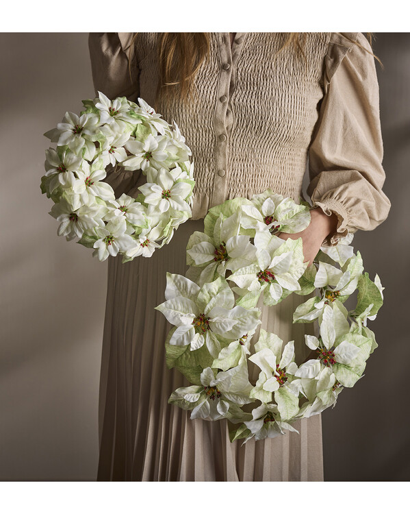 Skab en dejlig julestemning med denne smukke julekrans, der er omhyggeligt dekoreret med kunstige julestjerner. En klassisk og elegant dekoration, der leder tankerne hen på tradition og varme – perfekt til at byde gæster velkommen med stil. Kransen er lavet af holdbare materialer med et naturtro udseende, som holder sig flot sæson efter sæson. De smukke blomster og de detaljerede blade giver et luksuriøst indtryk, samtidig med at kransen kræver minimal vedligeholdelse.