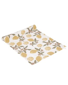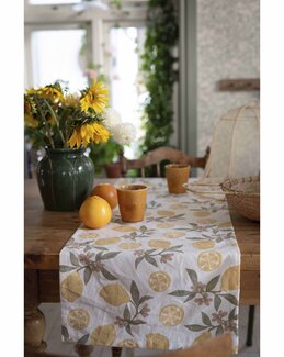 Denne smukke løber har et Amalfi-inspireret mønster med solgule citroner og er lavet af blødt og slidstærkt genbrugsmateriale. En stilfuld og bæredygtig detalje, der spreder en solrig og indbydende stemning på bordet – perfekt til både hverdag og fest.