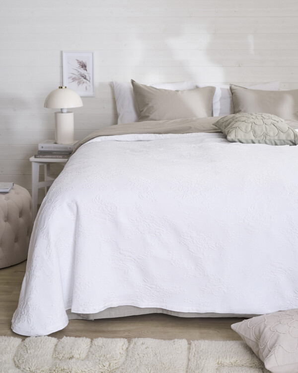 Smukt sengetæppe med diskret jacquardvævet blomstermønster – tidløs elegance