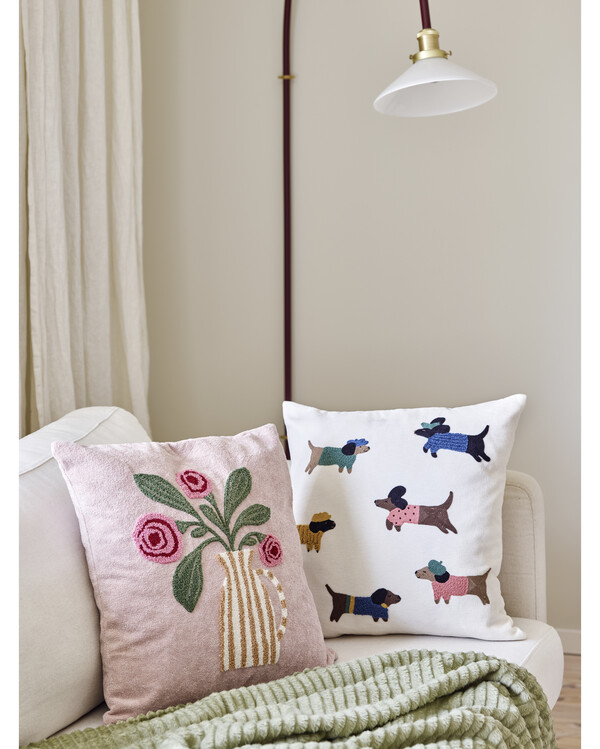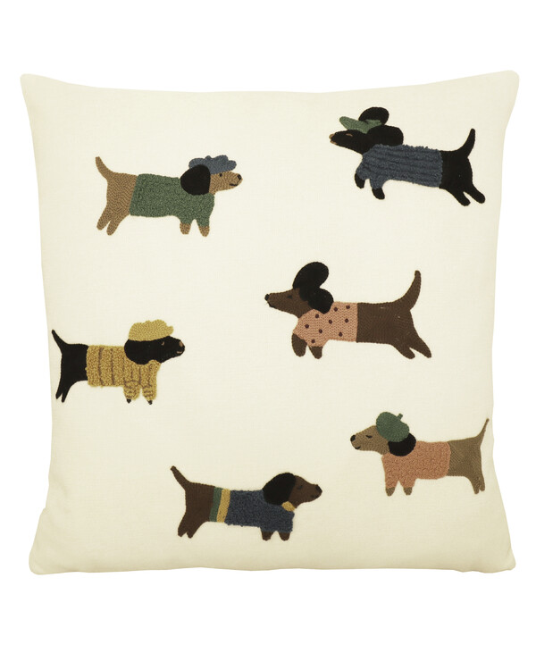 Charmerende pudebetræk med hunde i seje outfits! De detaljerede, broderede hundemotiver på blød chenille giver puden et legende og charmerende udtryk. Bagstykket er ensfarvet for et stilrent look, og den skjulte lynlås i bunden gør det nemt at tage betrækket af og på. Perfekt til at give sofaen eller sengen et personligt og humoristisk præg!