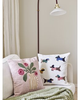 Charmerende pudebetræk med hunde i seje outfits! De detaljerede, broderede hundemotiver på blød chenille giver puden et ...