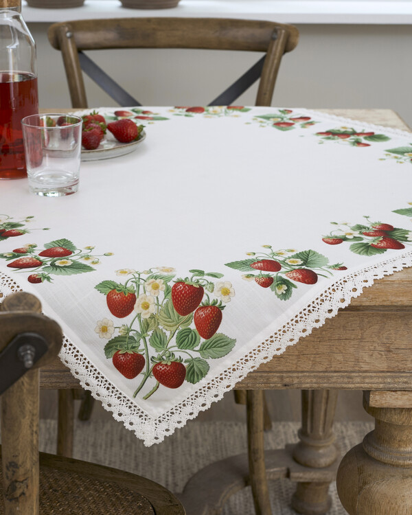 Vidunderlig borddug med trykt jordbærmotiv i skønne farver – perfekt til at skabe en sommerlig og legende stemning i hjemmet. Den dekorative blonde langs neders på bullen giver dugen en charmerende, landlig karakter, som passer lige så fint i køkkenet som på altanen.