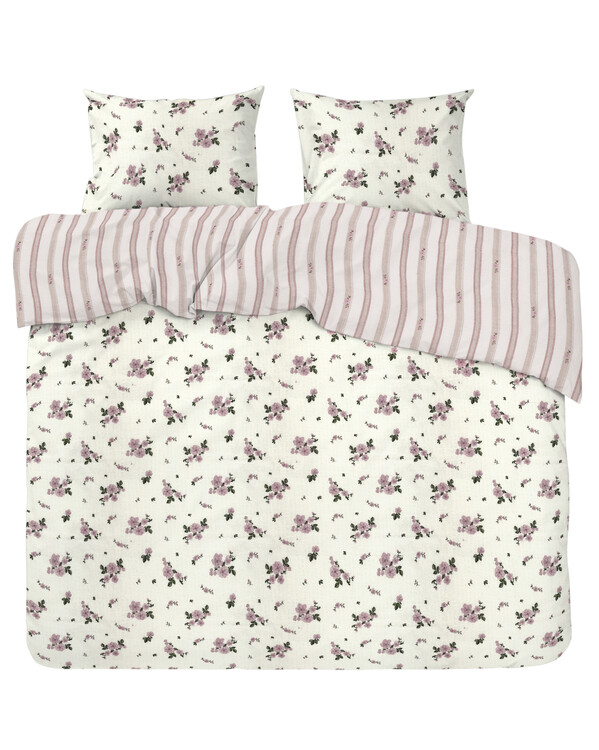 Skønt sengesæt i king size og i lækker Bæk & Bølge med et trykt småblomstret motiv på den ene side og matchende striber på den anden.