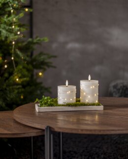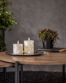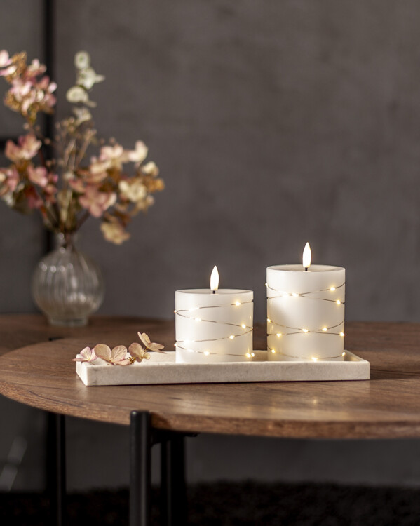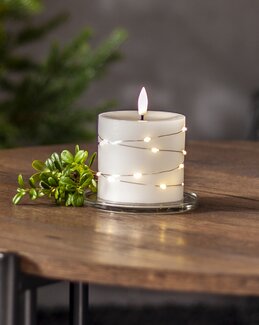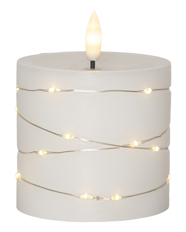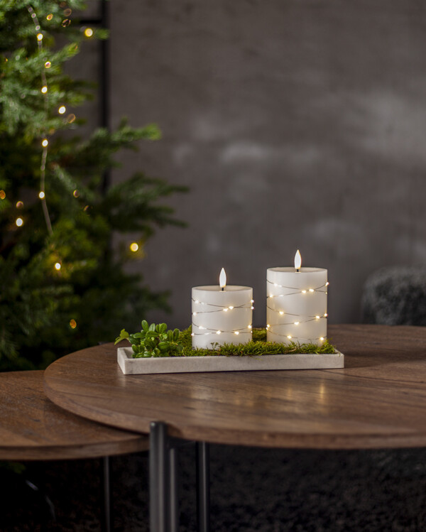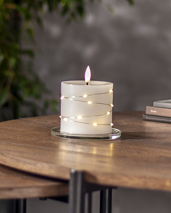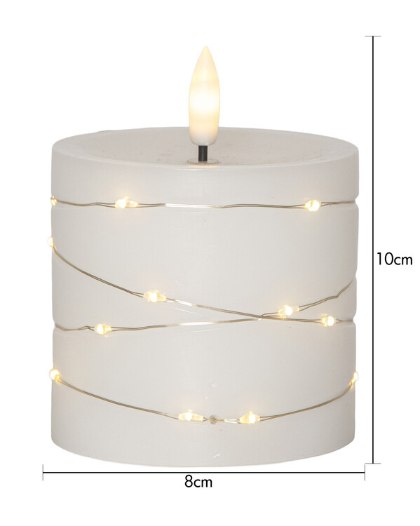 Skab en stemningsfuld og tryg atmosfære med vores batterilys i hvid stearin – et elegant LED-lys, der kombinerer klassisk design med moderne teknologi. Det naturtro stearinlys er dekoreret med en smukt snoet dew drop-lyskæde rundt om, som giver et blødt, glitrende skær og en eksklusiv følelse i rummet.