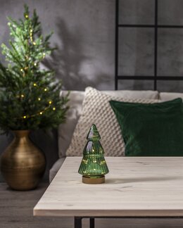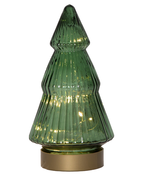Elegant borddekoration i form af et grantræ, fremstillet i transparent mørkegrønt glas med en guldfarvet base, der diskret skjuler batteriboksen. Den drives af 2 AAA-batterier og spreder et smukt skær – perfekt som stemningsfuld detalje på julebordet, vindueskarmen eller på en hylde. Findes i to størrelser, flotte hver for sig eller sammen i et harmonisk sæt.