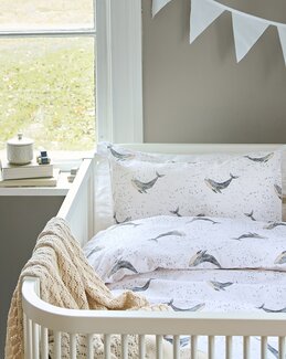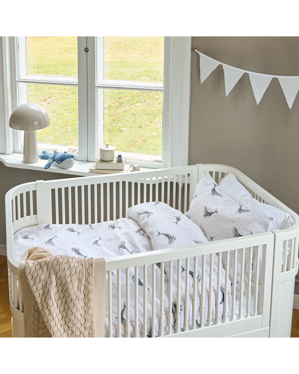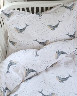 Giv soveværelset et legende og fantasifuldt præg med dette søde sengetøj dekoreret med trykt hvalmotiv i skønne blå nua...